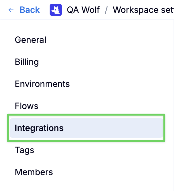 https://app.qawolf.com/<team slug>/settings/integrationsOr, navigate via the UI: