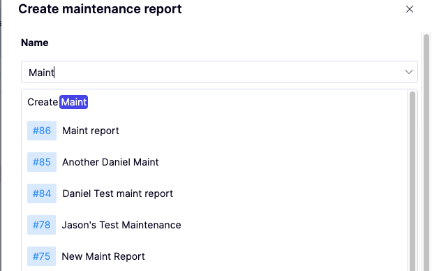 Click the Name field to open a dropdown of existing maintenance reports. As you type, the list autocompletes to help you find a match. Selecting an existing report will add your flow to that report in the Assign flows field belowa. If you need a new report, type its name and press Enter, or choose the top option in the dropdown.