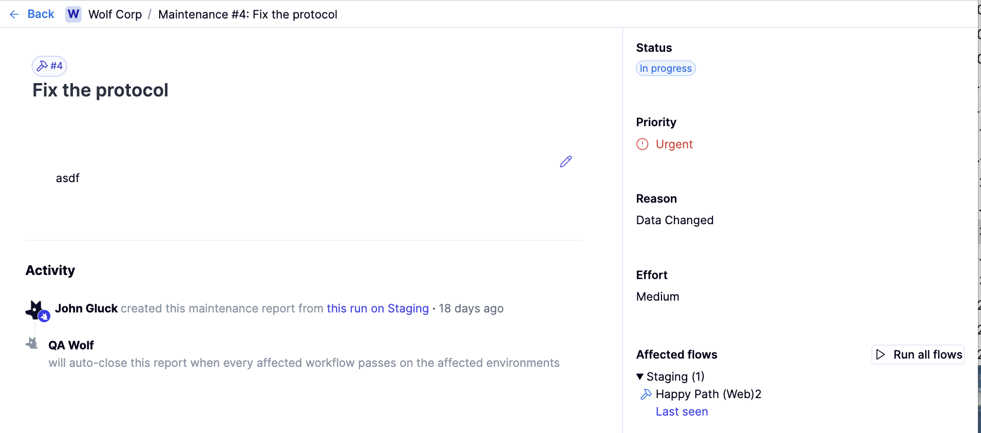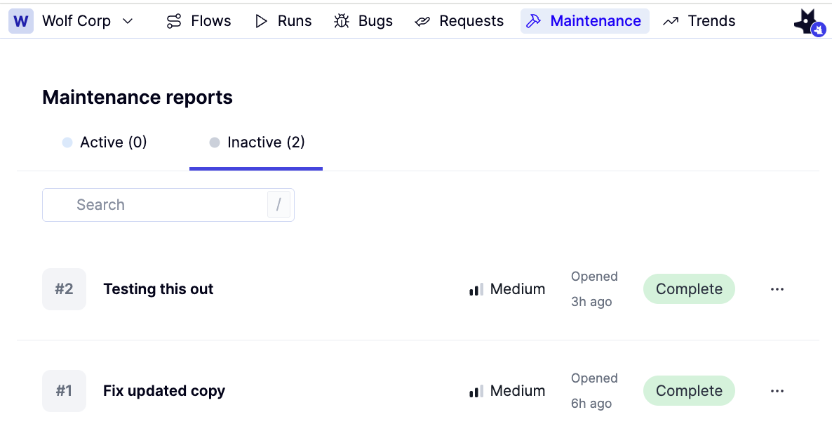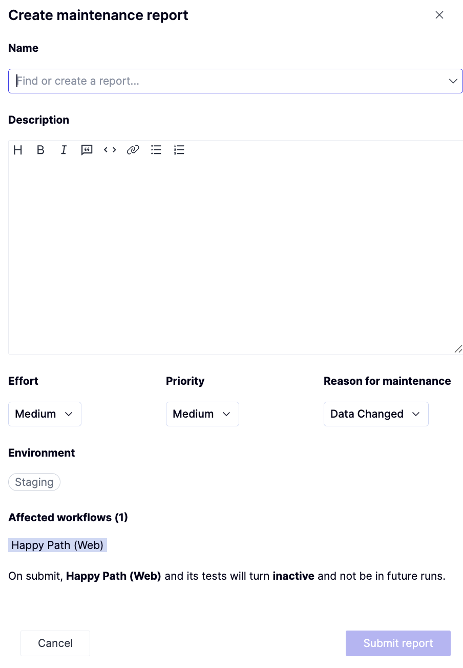 Maintenance reports track bugs in tests, not bugs in the product. They are used when a failure is caused by incorrect, outdated, or fragile test logic rather than an issue in the application under test. Maintenance reports cannot be created directly from the Maintenance tab. They are created from the Investigation view when reviewing a failing flow. Maintenance reports are linked to one or more flows. While a maintenance report is open, those flows are skipped in scheduled runs. When the flows pass in a manual run, the maintenance report automatically closes, and the flows are included in schedules again.How to create a maintenance report