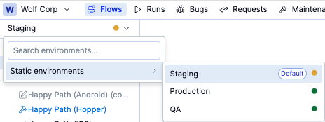 Typeenvironments list, each environment shows its status icon next to the name. (Type will be either Static or Preview)