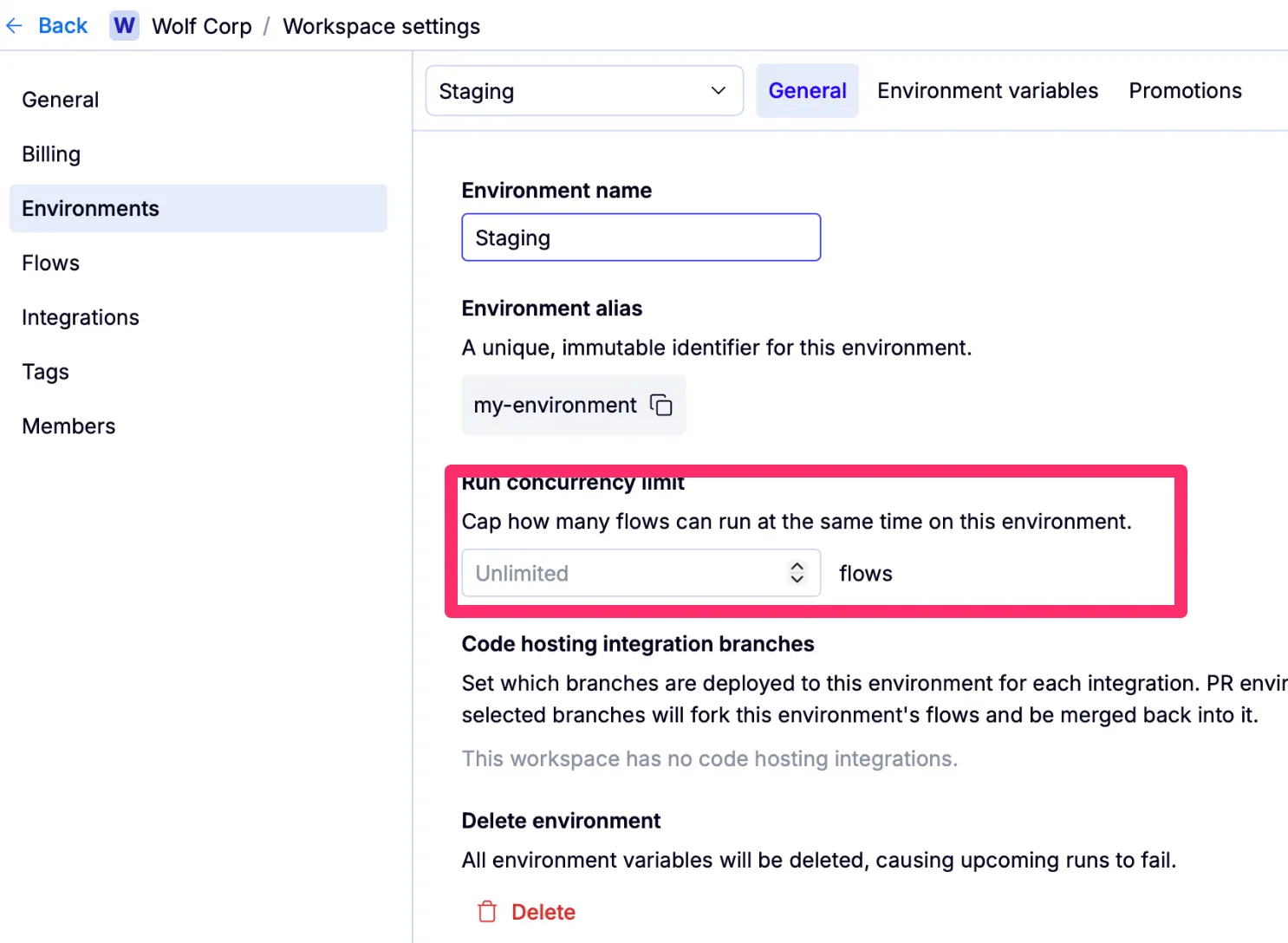 In the QA Wolf platform, an environment corresponds to a specific version of your app, such as development, staging, or production. Each environment can be configured with separate variables (e.g., base URL, users), concurrency rates, and other settings relevant to the application version you’re testing. Flows and tests are unique to each environment and are not shared across environments.How to: Create, rename, and delete environments