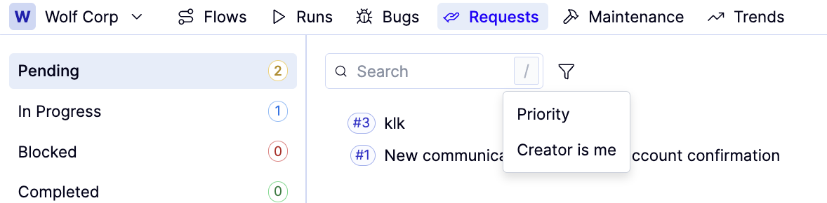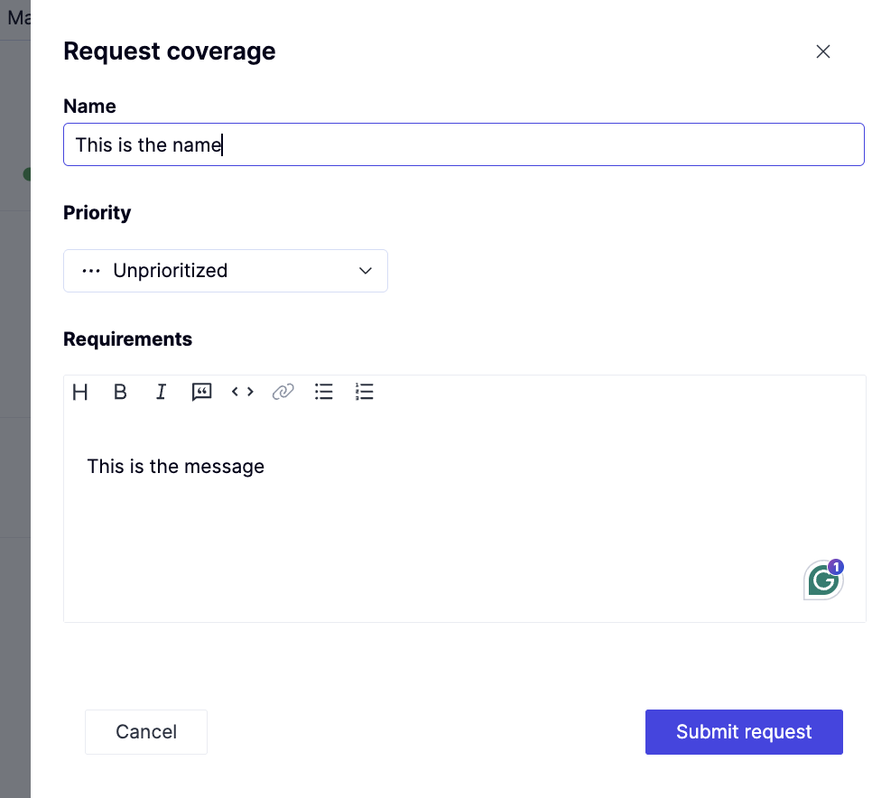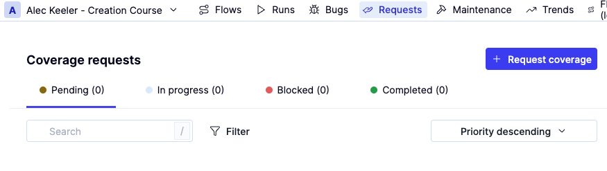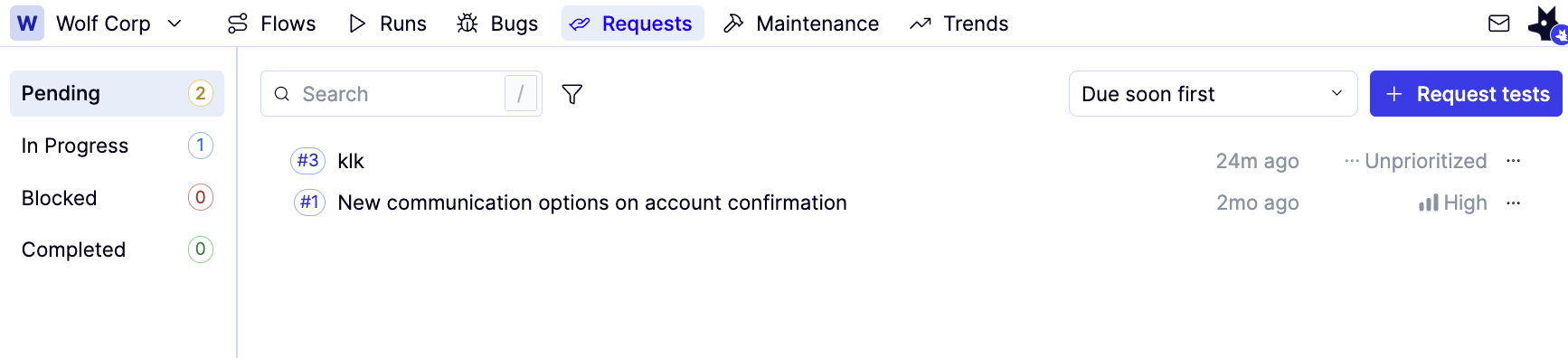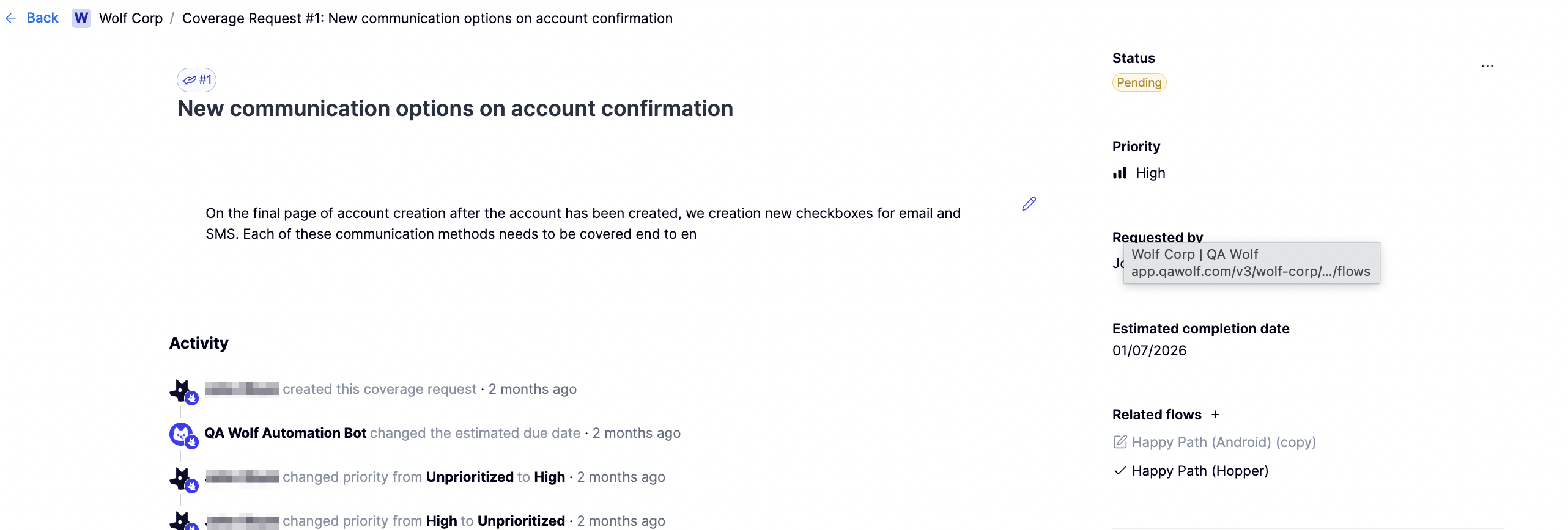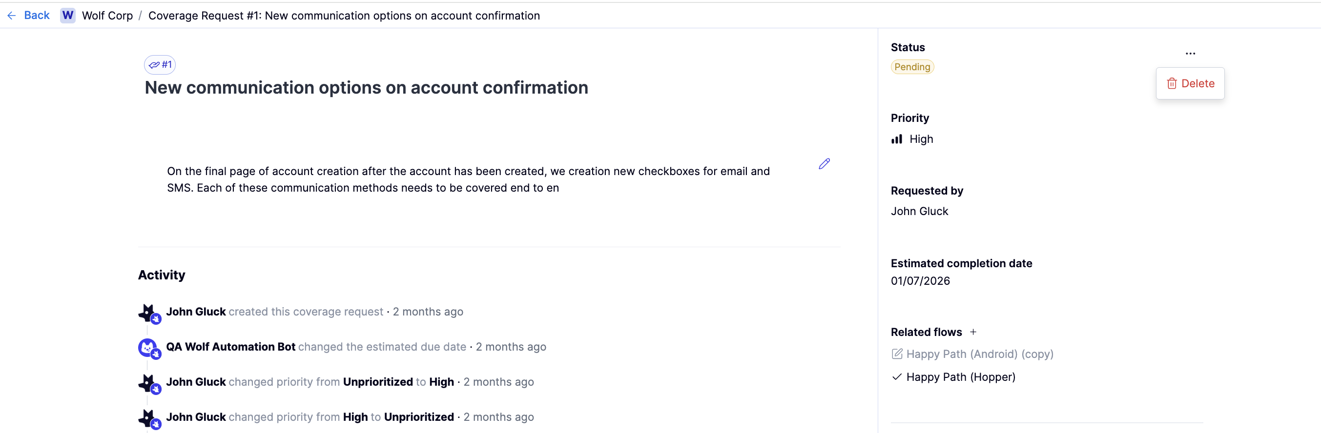 As soon as we receive the coverage request we will begin building tests. If you submitted a request via chat (Slack, Teams, Discord) or an issue tracker, a Coverage Request item will also be created in the QA Wolf platformHow to: Create a new request
