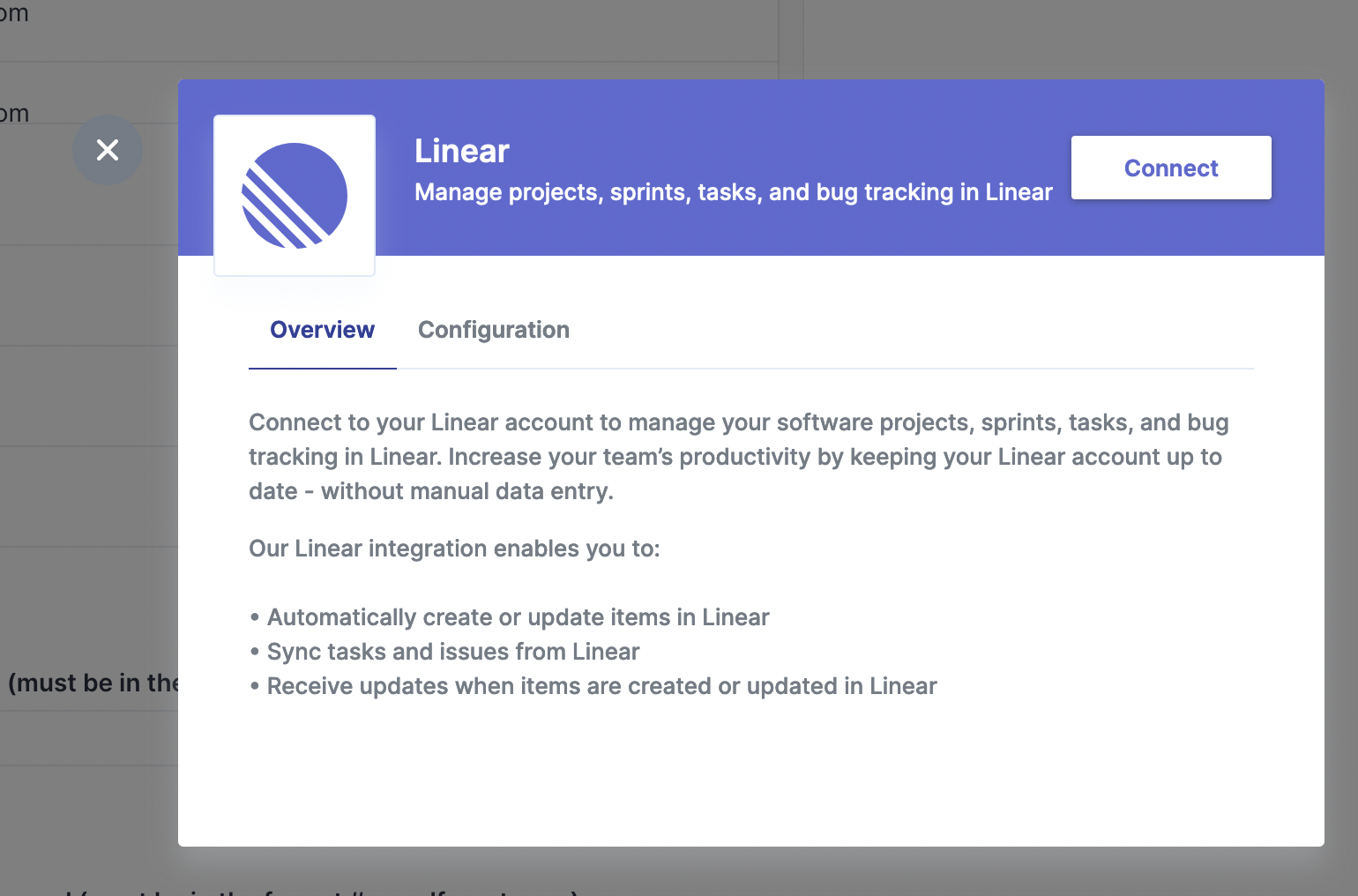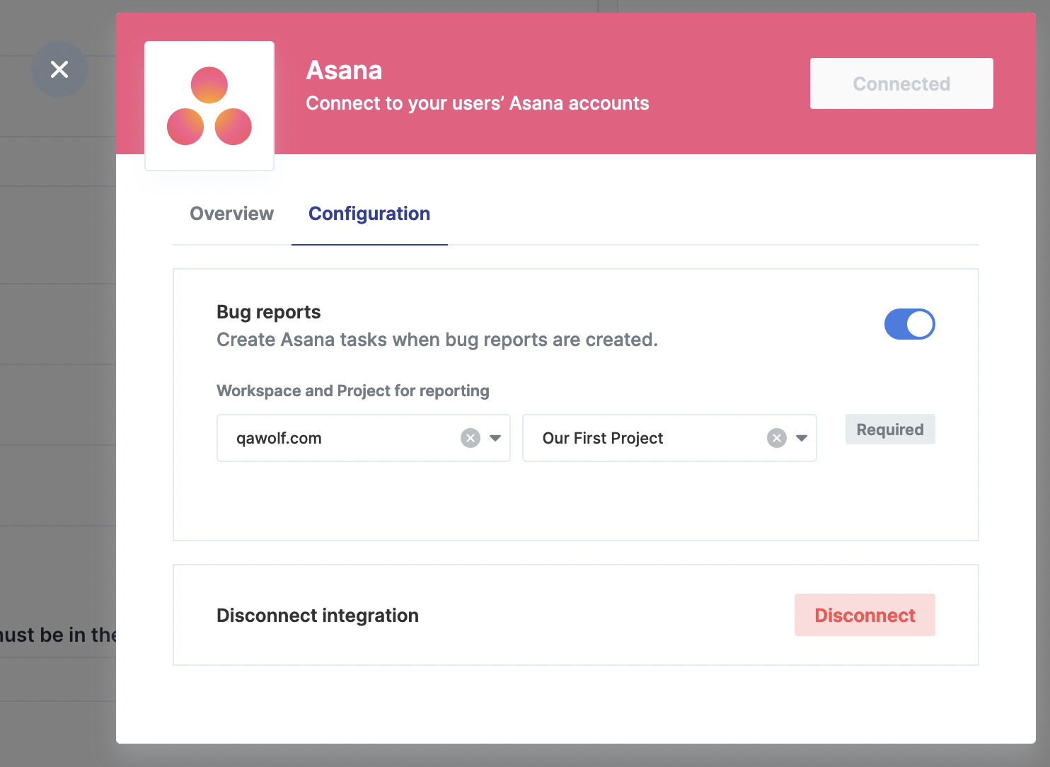 Update 8/8/23: There was a bug in our Paragon workflow that prevented us from receiving Linear Issue events from new Linear teams. The updated Paragon workflow will register for Linear Issue events for all teams, existing and new. Customers that are already connected (as of 8/8/23) to Linear will not receive events for new Linear teams. To get events for all new and existing Linear teams, disconnect and reconnect to the customer’s Linear org. Please make sure that we have access to their linear org (check 1Pass) before disconnecting their org. Otherwise, you will need to coordinate with the customer to reconnect their Linear.Configuring Asana