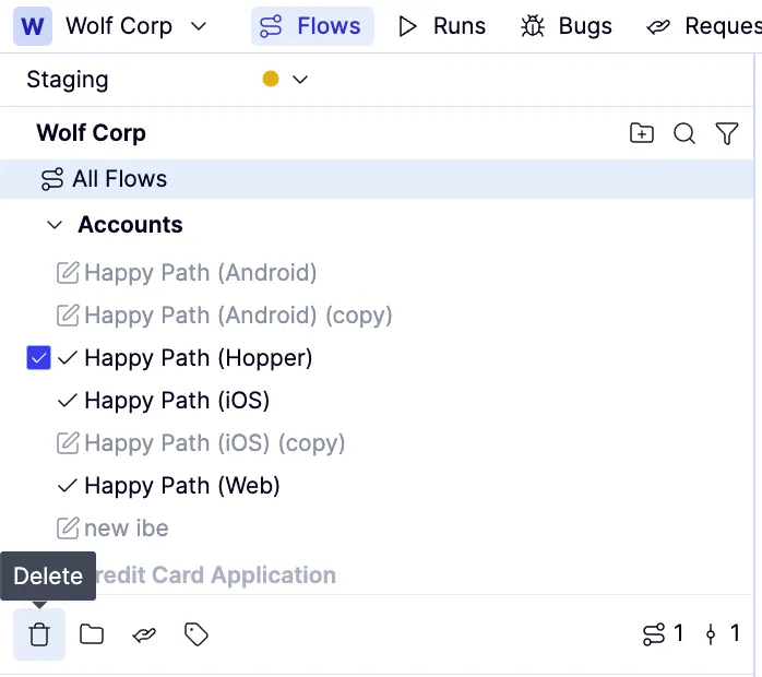 When deleting flows or groups, the name will be struck through, and red icons appear on the right to indicate they’re marked for deletion.