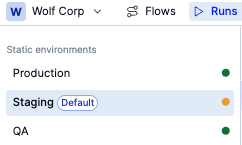 Typeenvironments list, each environment shows its status icon next to the name. (Type will be either Static or Preview)