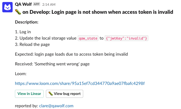 - Loom video walk-through of the bug and relevant additional information.