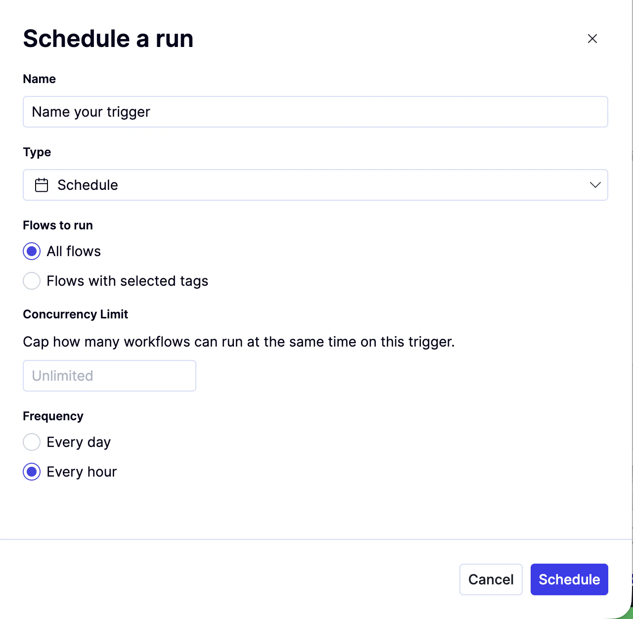c. Flows to run — run All flows or Flows with selected tags. See Use tags effectively to learn how to tag your flows.d. Concurrency limit — sets the maximum number of concurrent flows to control load on your system. This overrides the value set in Workspace settings → Environment.e. Frequency — choose Every day or Every hour.